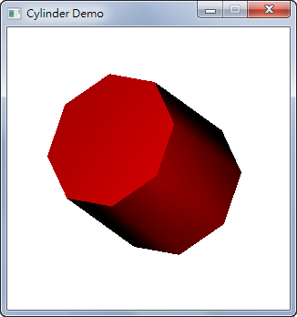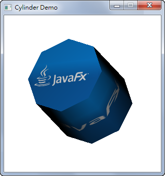 範例示範以Shape3D抽象類別的setMaterial()方法設定物體表面的材質,其中以PhongMaterial類別的setDiffuseColor()setSpecularColor()方法分別設定漫射光與反射光的顏色。此外並以Cylinder類別的建構函式設定divisions參數,將圓柱體切割為八角柱體 (Octagonal Prism):