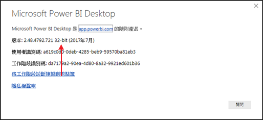 欲判斷Microsoft Power BI Desktop版本,可點選檔案分頁→「說明」→「關於」選項,顯示以下之對話框,以檢視Microsoft Power BI Desktop版本,例如32位元版本。