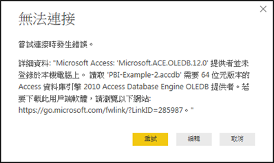 欲以Microsoft Power BI Desktop匯入Microsoft Access資料庫,必須安裝正確版本的用戶端軟體。若Microsoft Access為32位元版本,則Microsoft Power BI Desktop必須為32位元版本,才能開啟Microsoft Access資料庫。反之,若Microsoft Power BI Desktop為32位元版本,則Microsoft Access必須為32位元版本。以此類推,若Microsoft Access為64位元版本,則Microsoft Power BI Desktop必須為64位元版本,才能開啟Microsoft Access資料庫。反之,若Microsoft Power BI Desktop為64位元版本,則Microsoft Access必須為64位元版本。