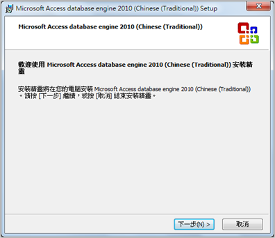 以32位元為例,自網站下載AccessDatabaseEngine.exe安裝程式之後,直接執行。以下為安裝說明,點選「下一步」按鈕: