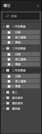 待完成套用查詢變更之後,將匯入所選取的Access資料表,並顯示於欄位窗格之中,以樹狀結構的方式顯示資料表與資料欄位之間的關係,如下圖所示。